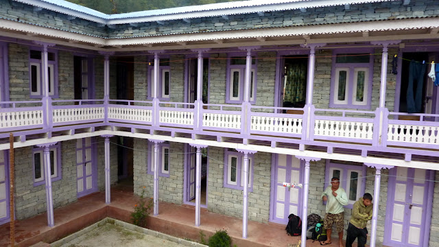 October 12, 2011. Besisahar (820 m) - Bhulbhule (840 m) - 9 km. Day one. Our first steps follow a path descending steeply to a small narrow river. We cross the bamboo bridge, quite unsteady under our feet. The trail gets larger and larger... it is a dirt road by now and we walk through rice fields and subtropical forests with the Marsyangdi River on our right. We pass Khudi, an old Gurung settlement to reach Bhulbhule, soon after a suspension bridge over the Marsyangdi Khola. On the wall outside the lodge where we stay overnight a sign reads: